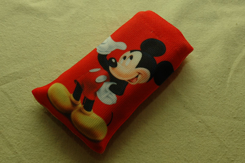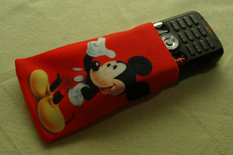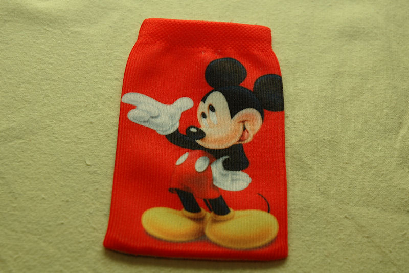 The cotton version is the red one with Mickey Mouse on both the front and the back. It is quite stretchable and will fit both smaller and larger phones as well as mp3 players, perhaps not the original iPod but sure the iPod nano, shuffle and similar sized players.