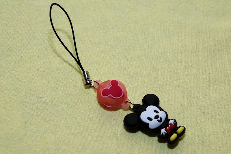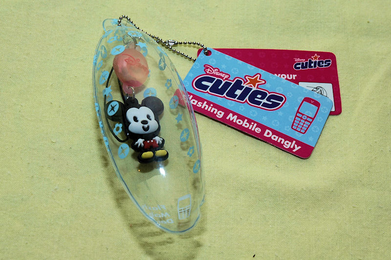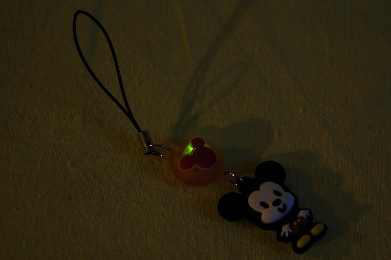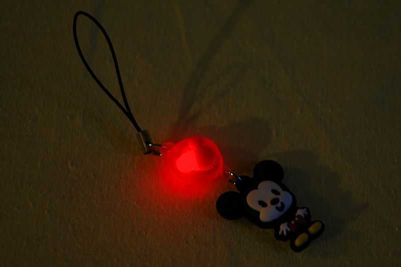Just above our Mickey Mouse cutie we have a small round pink piece and inside this there is some high-tech gear. If you remove the plastic strap from the battery inside, which is very easy, our cutie starts to blink whenever it gets touched by the GSM cell phone signals.