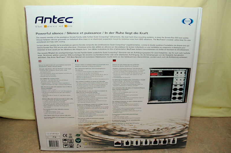 The back of the package shows us some information in three different languages about the product inside. It also tells us that we should find a 550W power supply inside. The contents of this package are also RoHS compliant.
