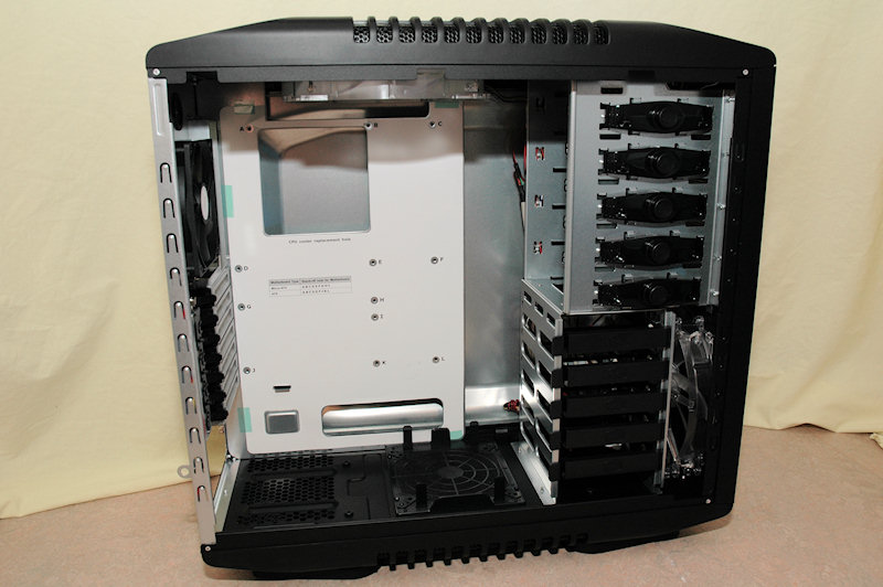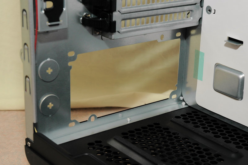 Vi har även ett större hål med beteckningen "CPU cooler replacement hole" där man kan från högra sidan av chassit enkelt installera en ny processor kylare med special montering utan att plocka ur moderkortet från chassit.
