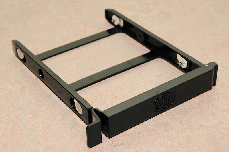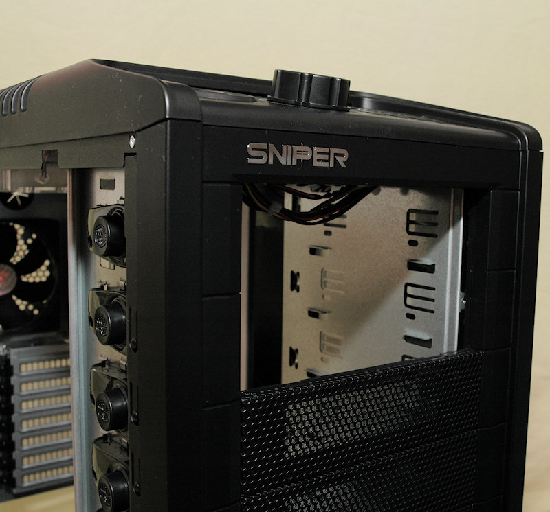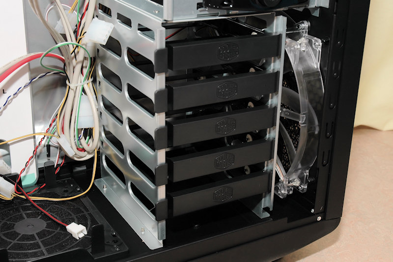Ovanför detta hittar vi utrymmet för 5.25 tums enheter där vi också har en total på fem stycken varav en kan göras om för att sätta in en 3.5 tums intern enhet. Installationen av dessa enheter har förenklats med CoolerMasters klick-lås där man endast behöver trycka på en knapp för att sätta fast enheterna.