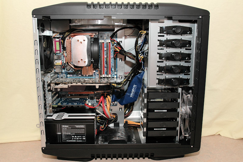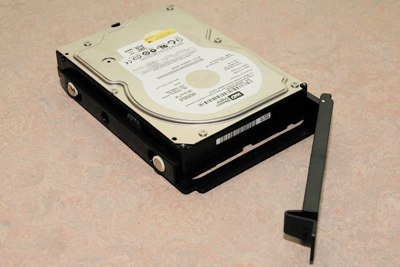 Framför fläktfiltret hittar vi ett diskrack där man kan installera upp till fem stycken diskar i hot-swap liknande stil. Tyvärr saknas kontrollerkort för hot-swap på baksidan av diskracket så vi får ju inte ett riktigt hot-swap rack.