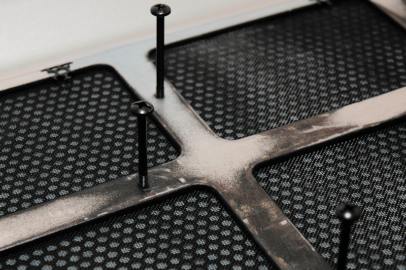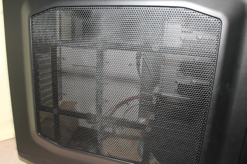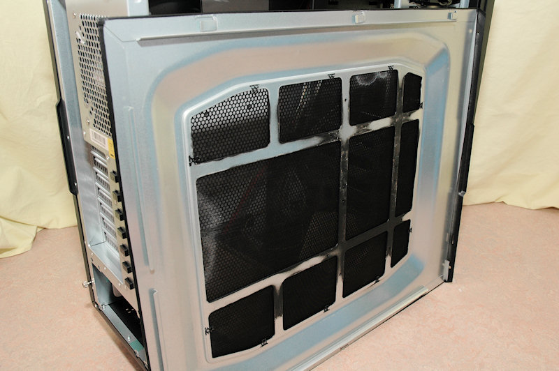 På insidan av dörren hittar vi ett finmaskigt filter som förhindrar att damm kommer in i chassit samt ett par hål för monteringen av ytterliggare en chassifläkt, extra lång special skruvar är inkluderade för detta.