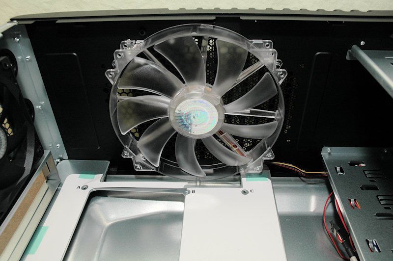 Om vi tittar upp och lite bakåt i chassit hittar vi den stora 200mm utblås fläkten i taket. Även denna är kopplad till både fläktkontrollen och ljusknappen i fronten av chassit eftersom även denna har led belysning.