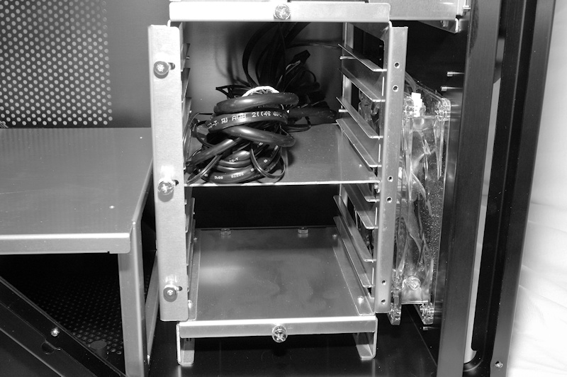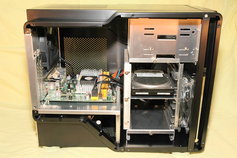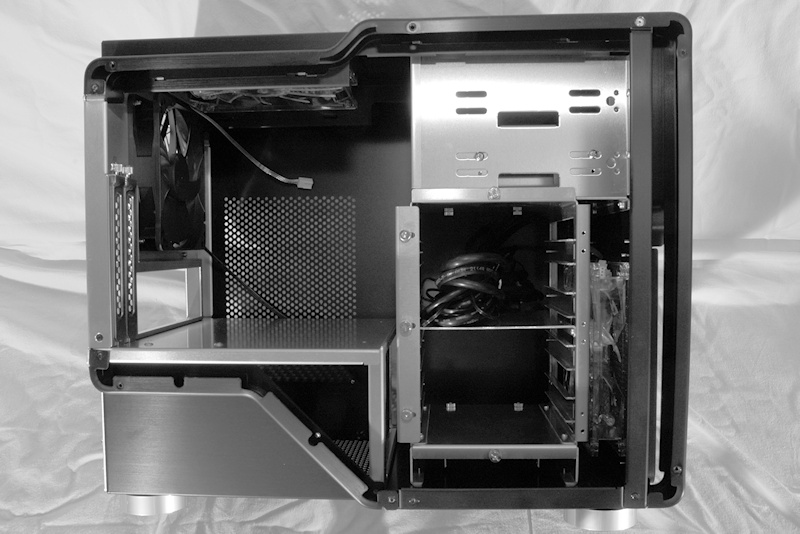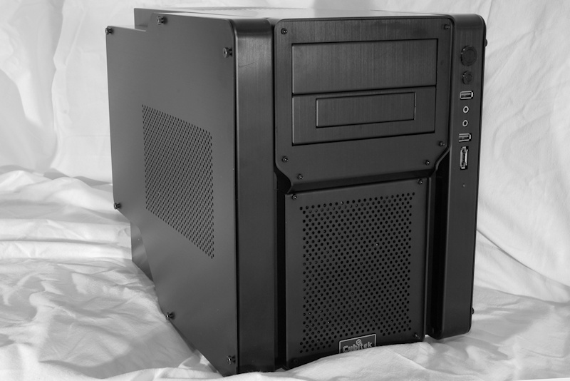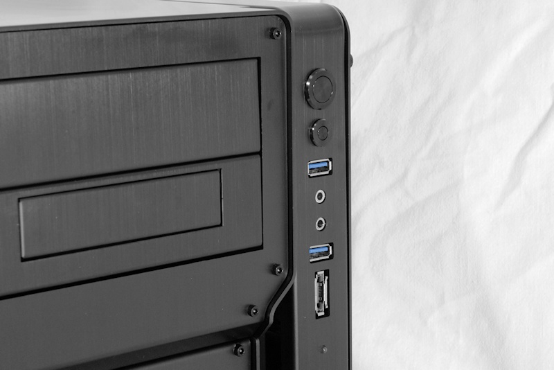 The case is made out of aluminum, more or less completely black. The whole case is put together with allen screws, which surely is good looking and also a little bit harder for an intruder to open up straight away. The front panel features two 5.25 inch drive bays while one of those can be used as a 3.5 drive bay for smaller fan-controllers, memory card readers and such.