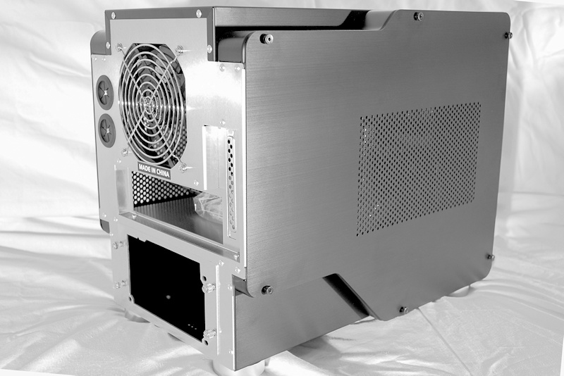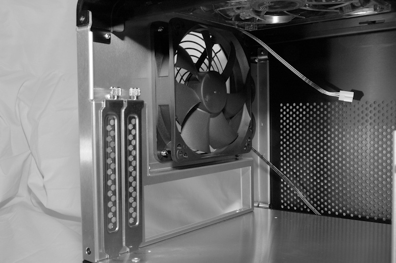 Turning the case around to the back reveals a large 120mm fan, which will blow hot air out from the case. Two expansion plates, the IO-shield space for the motherboard, PSU hole and last but not least, two rubber grommets making the case ready for some external water-cooling solution.