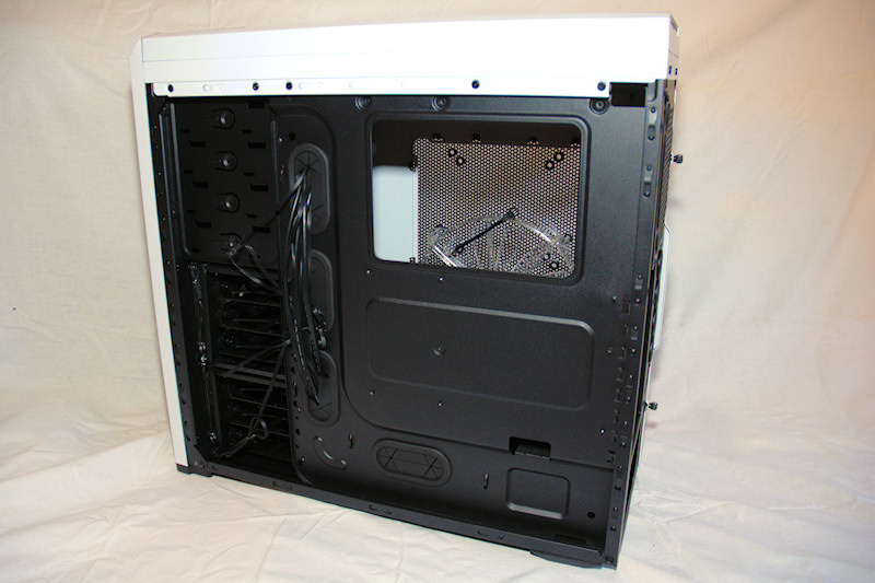 The right side of the case features some routing area for the cables with four rubber grommets to route the cables through. I must say that it was a bit hard to route the cables in a proper way, but with some minor violence it was possible and I sure hope that I don't have to open up the right side any time soon ;)