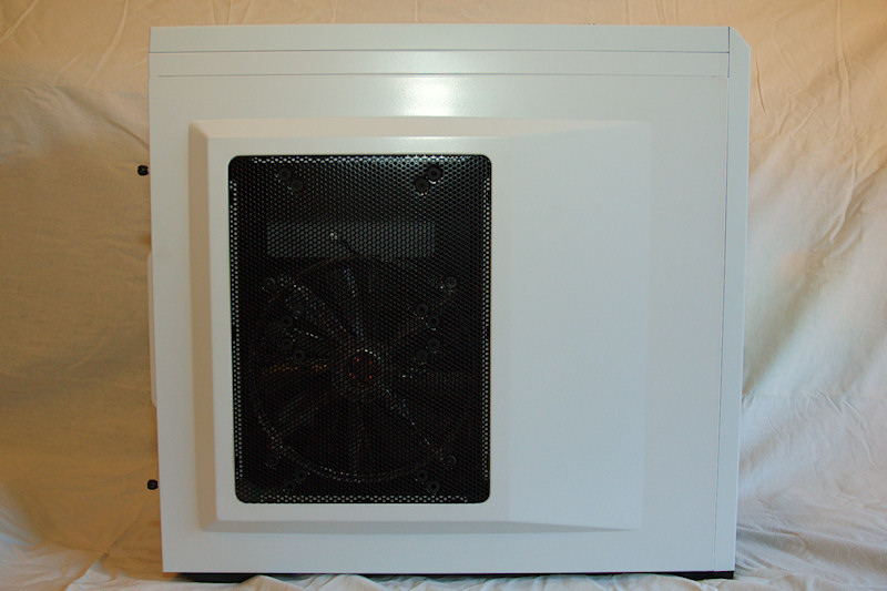 Popping the side panels off is quite easy with captive thumbscrews which stay in the side-panels to prevent the loss of them. On the inside of the left panel we see the 200mm fan installed. This fan can be removed in favor for two 120mm or 140mm fans.
