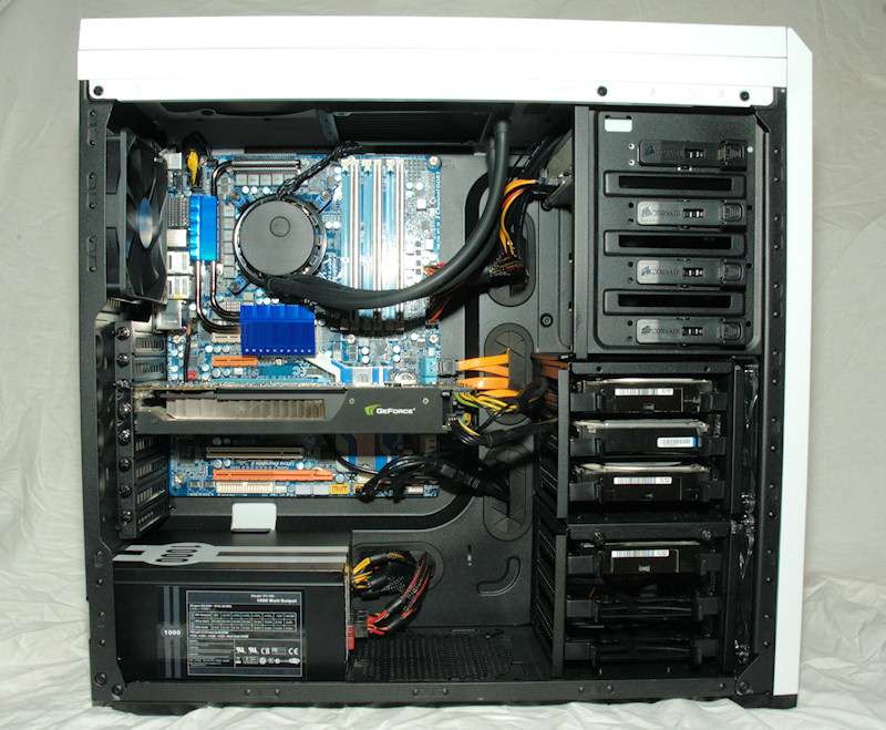 Finally we're inside the case and here we can see the two drive cages which can hold a total of six disk drives, either in 3.5 inch format or smaller 2.5 inch drives such as SSD. Both drive cages can be removed and used independently.