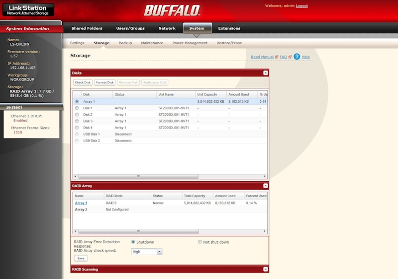 Further functionality of the LinkStation includes two USB 2.0 ports, one on the front and one on the back. These can both be used for connecting additional USB storage or a USB enabled printer, making it a network printer instead. The front USB port also has a companion button which can be used for automatically transfer the whole USB stick to a predefined directory on the LinkStation.