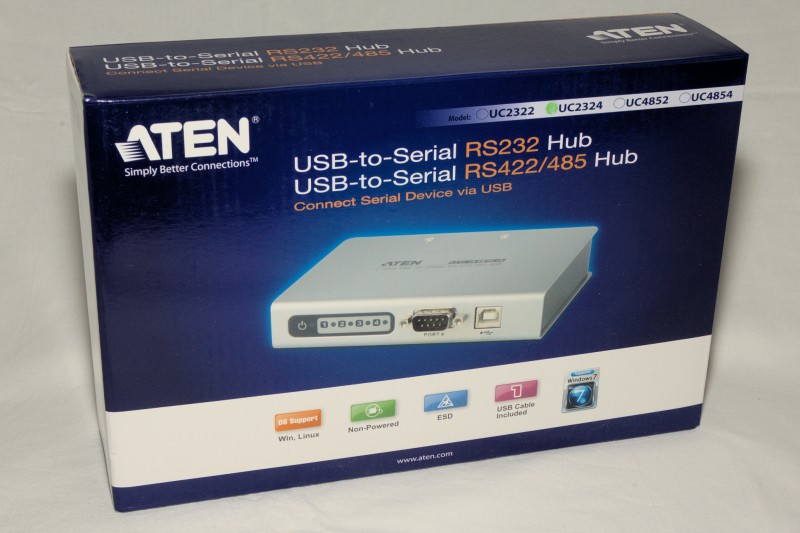 The product we're looking at is the USB-to-serial RS232 Hub, UC2324 made by Aten. As the product name says, this product connects to a USB port on your computer and gives you a hub of four RS232 ports.