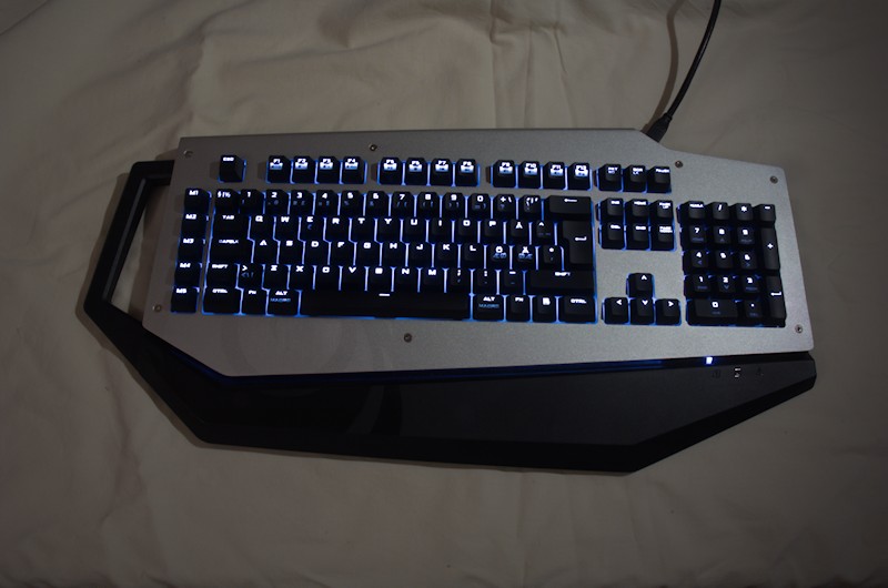 Last but not least, some action-photos. First off we have all keys fully lit and while the photo shows some blur over the keys they are very easy to read in real life. However, at full power they are too bright for my own taste, so I rather step down a notch or two. Second photo is the gaming mode, M1 through M5 is lit, and those are the macro keys, we also get the WASD and arrow keys lit up.