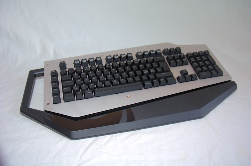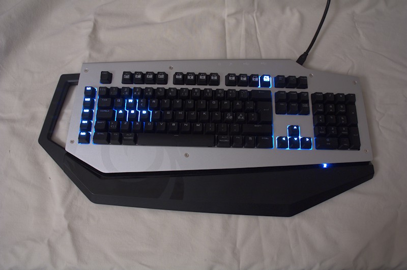 Opening up the protective back we find a very heavy and, in my opinion, a very stylish keyboard with what seems to be a perfect setup of spacing between the keys. The Mech has a built-in hand-rest but also as you can see on the left side a handle which at least on the outside seems to be pure plastic, I have actually no idea if there is any sort of metal inside of it but I hope so. Anyhow the handle seems to be very sturdy so you should be able to carry it around quite easily.