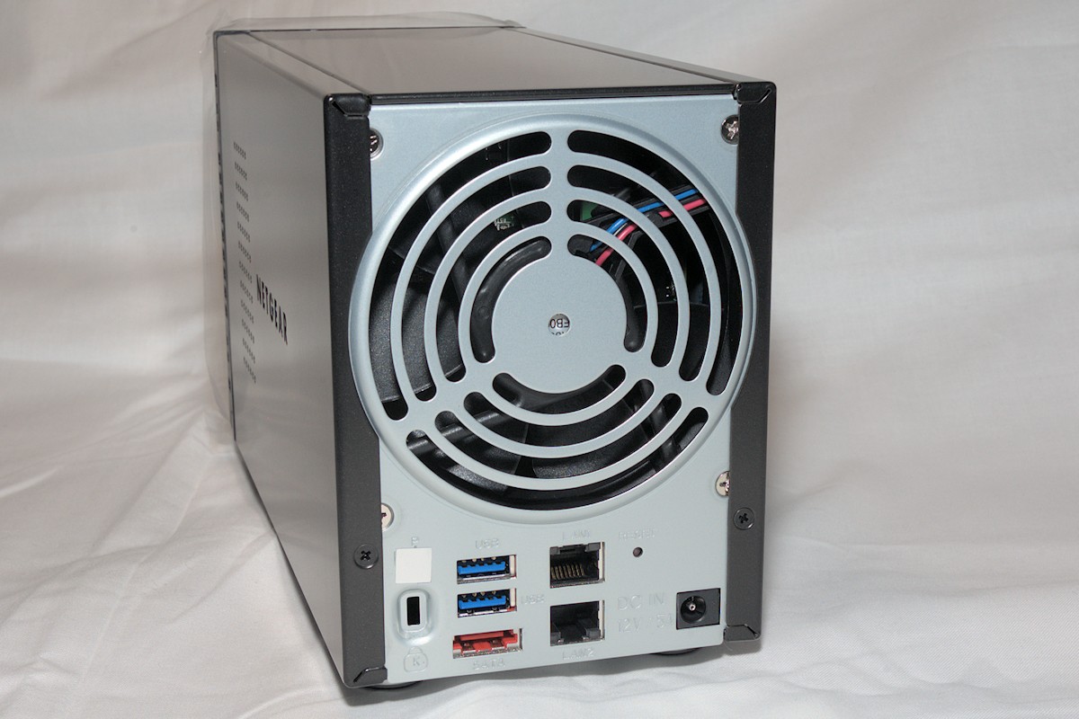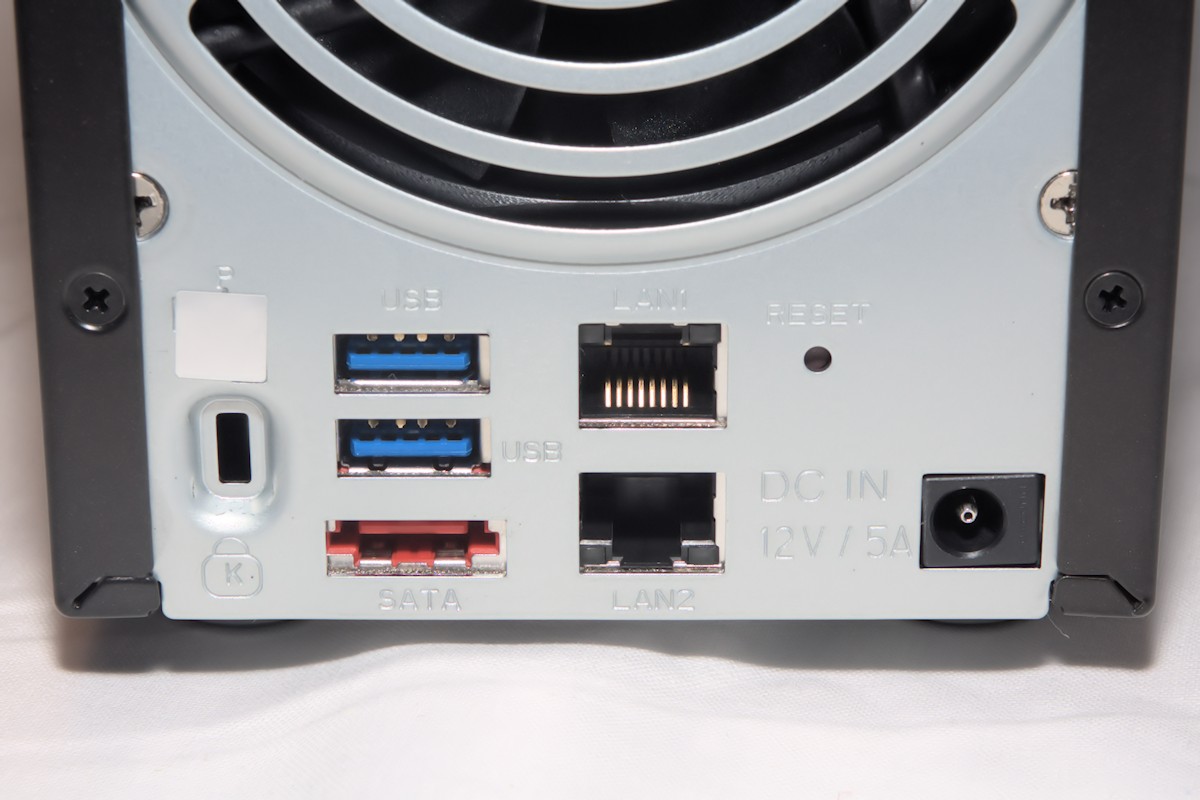 On the back of the unit we find a 92mm fan that seems to be very quiet, during all our tests it has not spun up and made any noticeable noise. Two additional USB 3.0 ports, an eSATA port, the two LAN ports with link aggregation, an recessed reset button, power supply connector and last but not least a Kensington slot if you feel that you need to secure your unit.