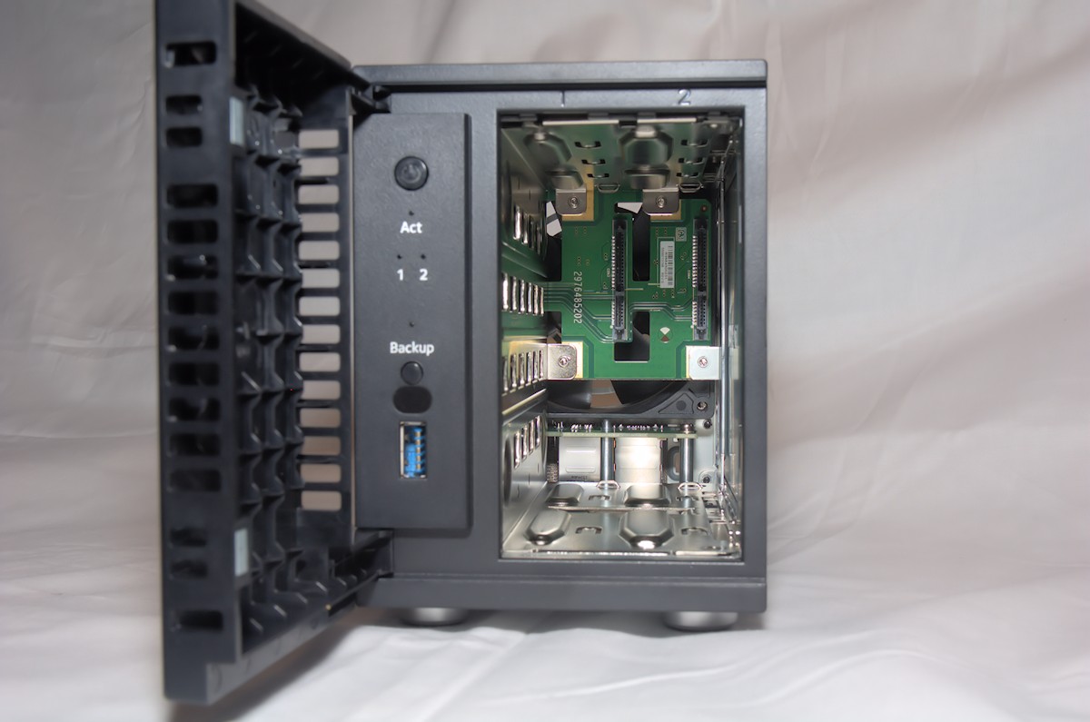 Furthermore we find a power button, five LEDs; power, activity, disk 1 and disk 2 and a USB/Backup LED. We also find a USB 3.0 for connecting a USB drive which you can backup to or from, or perhaps connecting a printer.