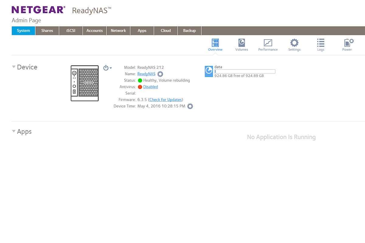 After that you head over to the ReadyNAS page of your particular device. From here you can first off see the status of your drives and the unit itself. As we've just installed our two drives it needs to build a RAID configuration on them which has been kindly configured by Netgear already. The RAID that is set to be used by default on this unit is a RAID 1 which means that all content on your NAS is mirrored on both disk drives.