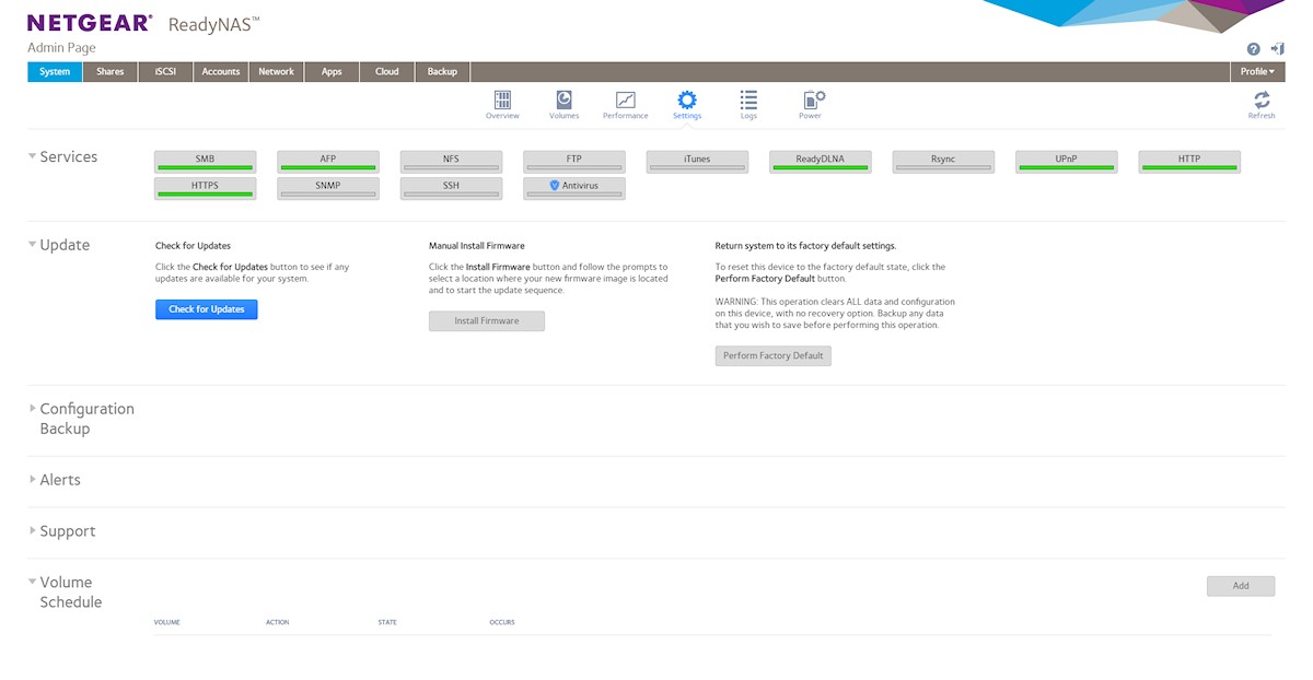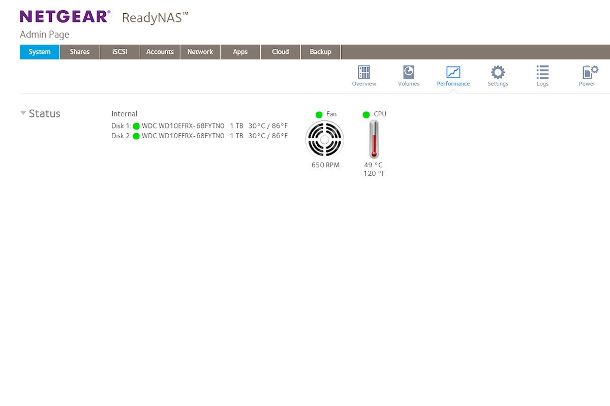 There is also a performance tab on which you can see the temperatures of your drives and the CPU as well as the RPM for the fan in the back, which never seemed to spin up above 650 RPM which is very nice. Of course, there was not enough heat inside the RN212 unit to need a higher fan speed.