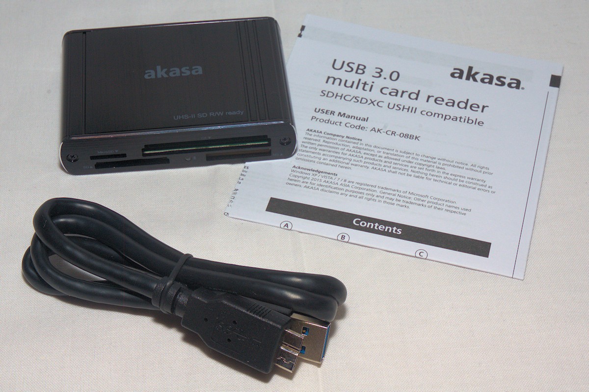 The AK-CR-08BK is very stylish with its brushed aluminum housing and machined openings for the memory card slots. All slots are very easy to access and push the memory card into, except the microSD in which you could, if you hold the card in a too steep angle push up above the slot and lose inside the card reader.