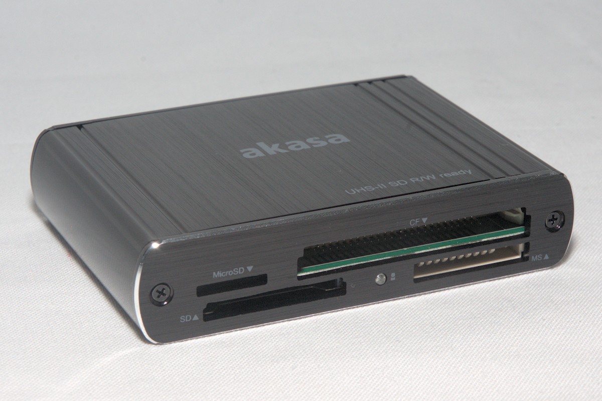 With the AK-CR-08BK Akasa presents an external memory card reader, but they do offer more or less the same product but as an internal version as well along several other models. Internal models have their benefits, for example you can't lose the cable so you can't plug it in, but an external reader is very convenient in the way that you can take it with you, just dump it in your camera bag and you're set to upload your photos anywhere you find a computer.