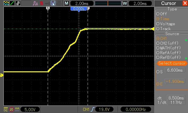 When measuring the startup of the NP90 on an oscilloscope we can see that the startup takes about 8.5ms which certainly is very fast. But more importantly is that the output voltage of the power adapter goes from 5V up to 19.6V and stays there indefinitely, until disconnected of course.