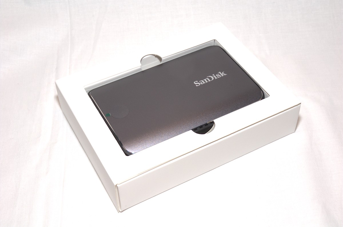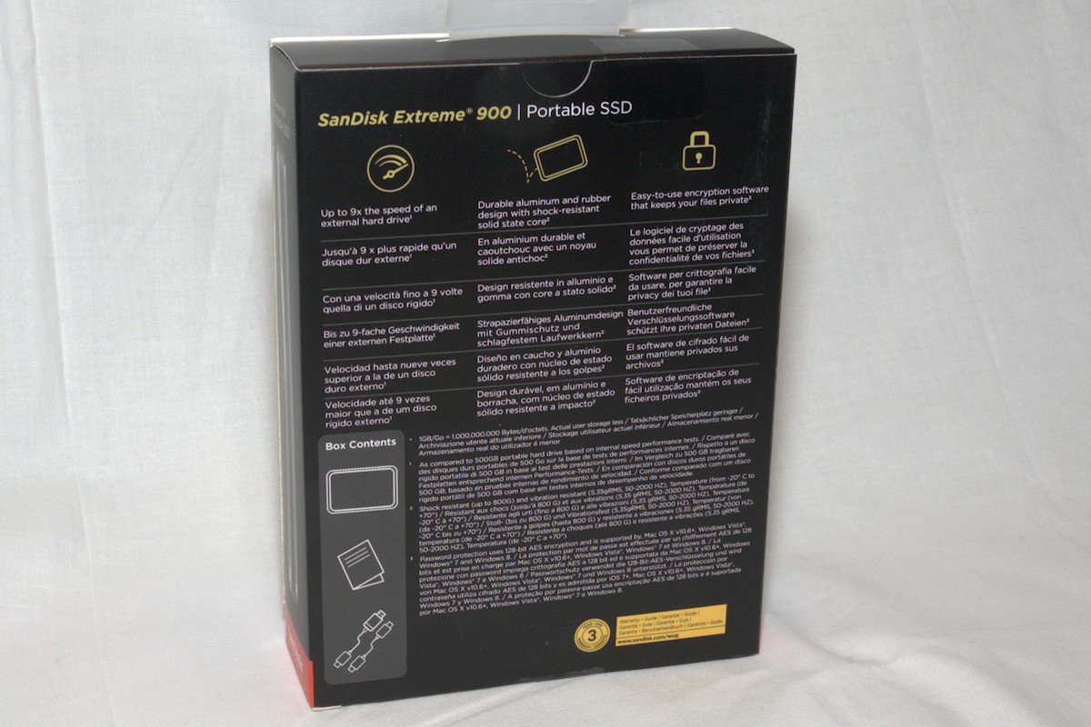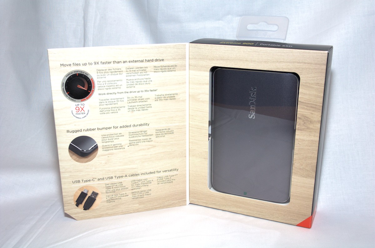 The Sandisk Extreme 900 comes in a very stylish package and when it's very stylish, it features a hinged front that opens up to reveal the product itself behind a window. Overall, a very nice box with lots of information. For example, that you should see a 9x speed increase compared to other USB storage devices and that this device features the new type of USB connector, the Type-C, which is reversible. Finally an end to figuring out which way you have to plug in the cable.