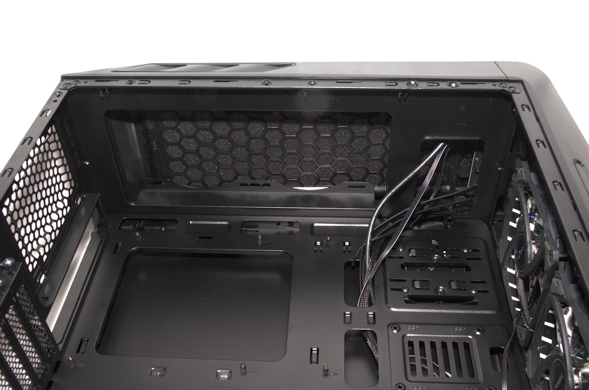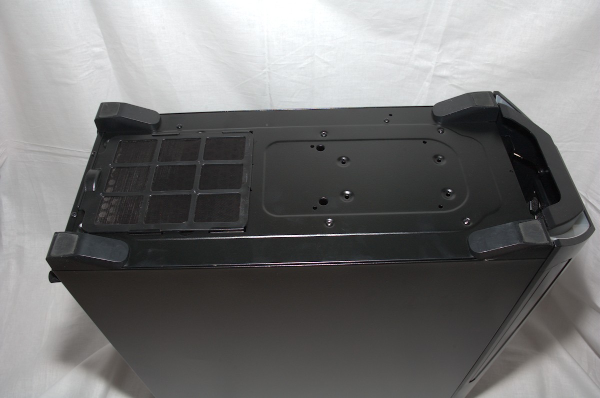 In the top we can see the air filter and a spot for two 120mm fans and space for a water cooling radiator. I love it when it's built in without taking up space for the rest of the components. It is so simple, so I don't understand why it isn't always built in like this. Many manufacturers, even Antec sometimes, lets the top cooling eat up space that is needed for the motherboard making it either difficult or at least hard to install water cooling. The solution in the GX1200 is perfect!