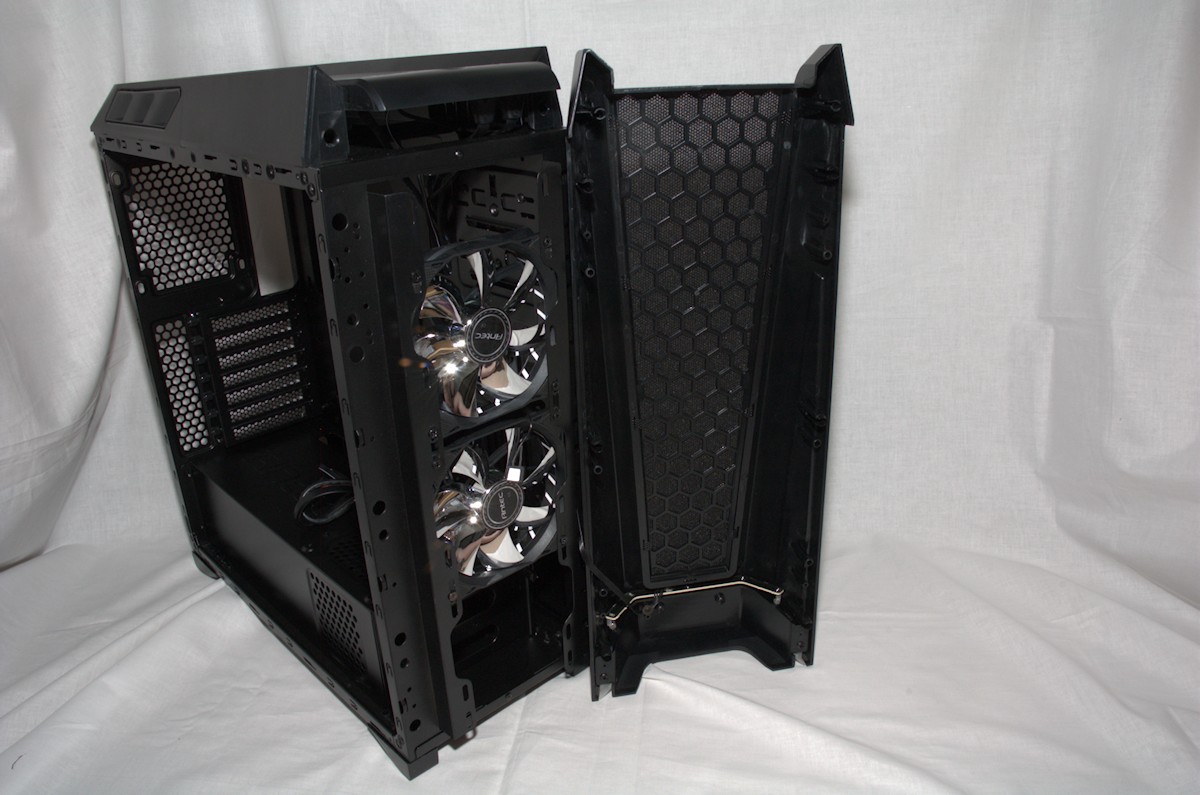 As we can see in the front we have two 120mm fans, blowing air first over the SSD spots and then onto the motherboard. Supported motherboards for this case are mini ITX, micro ATX and the standard ATX form factor.