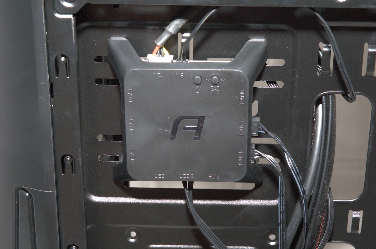 The plastic part with an A on it – where we normally fasten our 5.25" devices – is actually a fan speed and LED controller. We can control the speed for up to 6 fans and the LED color of three fans. At the moment we have two LED fans in the front, which are called RGB fans. However, we don't get the true RGB function of these but instead 7 defined colors. This certainly isn't bad, but calling them RGB fans is a little bit on the wrong side.