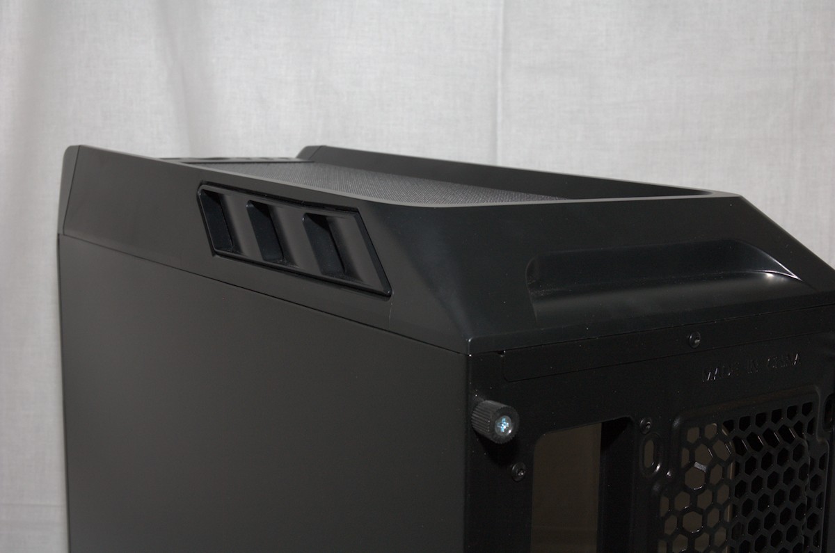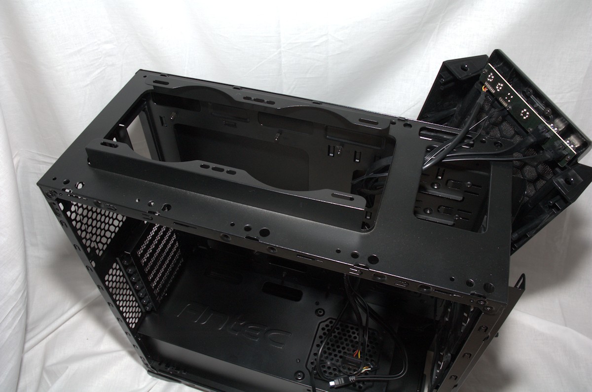 Something I miss is 5.25" slots, at least one. It might not be something that gamers are in need of these days and that is probably why Antec has skipped those. However, if we take a look at the top right inside the case there are shapes in the metalwork indicating that the panel is prepared for two 5.25" slots. But of course, the front isn't prepared and there is no counterpart to hold the other side of the 5.25" units, so obviously this case isn't made for those. But why are those left in the panel?