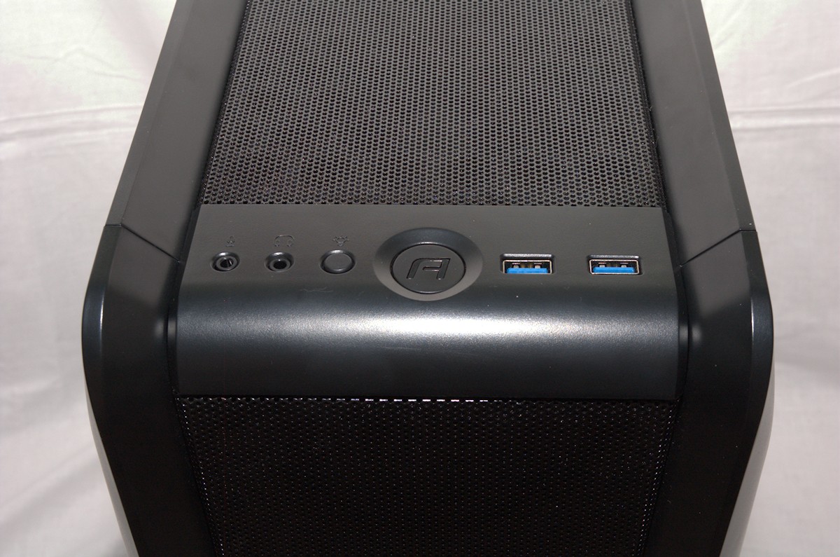 Top front we have the power and LED button, as well as two USB 3 ports and the usual headphone and microphone jack.